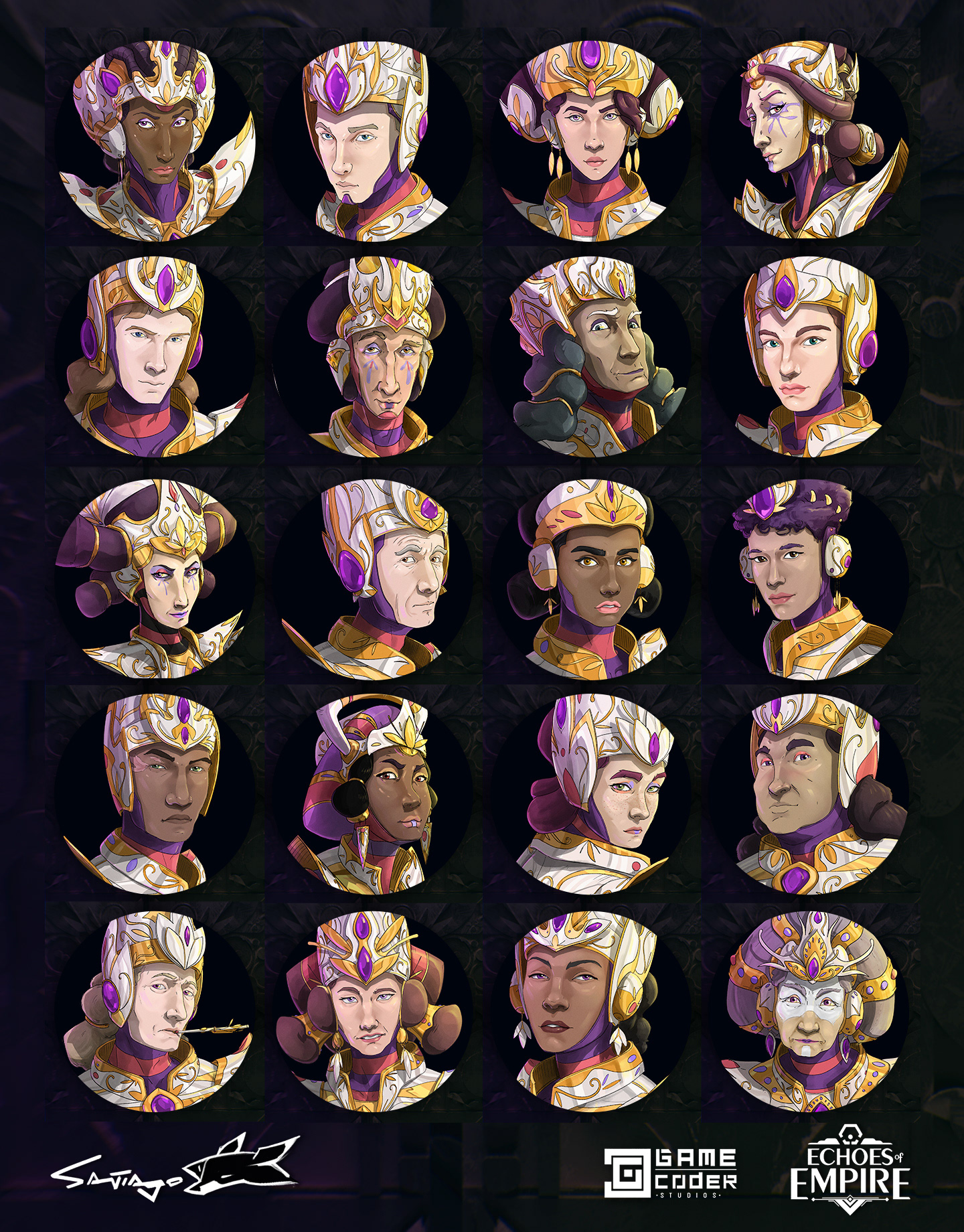 Character design for the three factions available in Echoes of Empire that you can choose to play with and develop your strategy around them with their different ships, equipment and researches. Each character was created with a unique design and personality to create a vast group of people that shape the wills, goals and needs of each faction.
